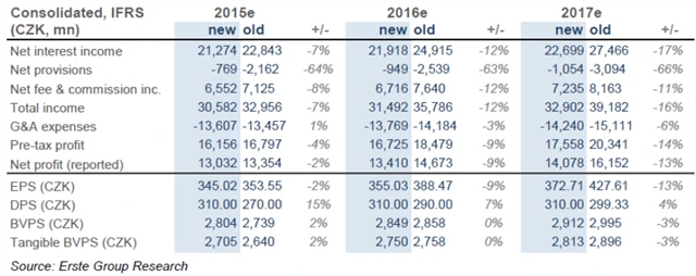 Nižší projekce čistého zisku, spolu s tlakem na výnosy z poplatků a provizí, byly hlavními důvody snížení výhledu finanční výkonnosti Komerční banky pro nejbližší roky. Nižší odhady výnosů mohou být pouze částečně vykompenzovány značnými poklesy v nákladech na riziko. Odhad zisku na akcii pro letošní rok tak klesá ke 345 Kč. "V nadcházejících letech očekáváme stabilní dividendu na vysokých úrovních okolo 310 Kč na akcii," doplňuje analytik.
