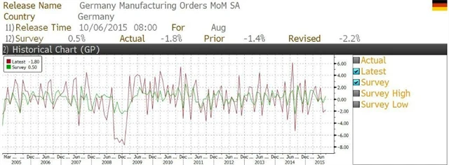 Německé průmyslové objednávky v srpnu nečekaně klesly. Pravděpodobně jde o signál toho, že na největší evropskou ekonomiku dopadá slabší růst Číny a dalších rozvíjejících se trhů. Objednávky očištěné o sezónní vlivy a inflaci spadly v srpnu o 1,8 % po revidovaném červencovém poklesu o 2,2 %. Analytici oslovení agenturou Bloomberg očekávali u tohoto volatilního údaje v mediánu růst o 0,5 %. Meziročně objednávky vzrostly o 1,9 %.