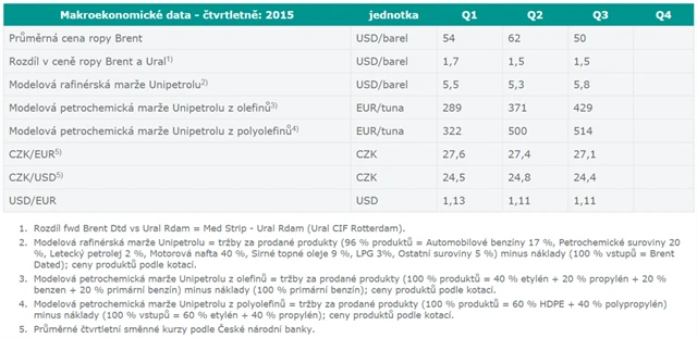 Petrochemická marže se v září meziměsíčně snížila o 27,5 %, ale meziročně naopak o 42,9 % vzrostla. Rozdíl mezi cenou ropy Ural a Brent v září činil 1,5 USD na barel, stejně tak i v celém 3. čtvrtletí. V srpnu byl rozdíl 1,6 USD na barel, ve 2. čtvrtletí 1,5 USD na barel a před rokem ve 3. čtvrtletí 1,8 USD na barel.