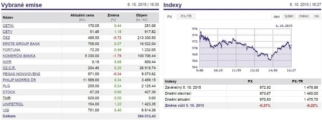 Třetí největší zobchodovaný objem si připsala O2 C.R., která naopak o 0,2 % zpevnila, a dařilo se i druhé bankovní emisi na burze, Erste Group Bank, která přidala 0,57 %. Akcie Unipetrolu zpevnily o 1,22 % poté, co společnost zveřejnila modelové marže za září i celé letošní třetí čtvrtletí. Modelová rafinérská marže dosáhla v září 5 dolarů na barel, modelová petrochemická marže z olefinů 355 dolarů na tunu a modelová petrochemická marže z polyolefinů 487 dolarů na tunu.