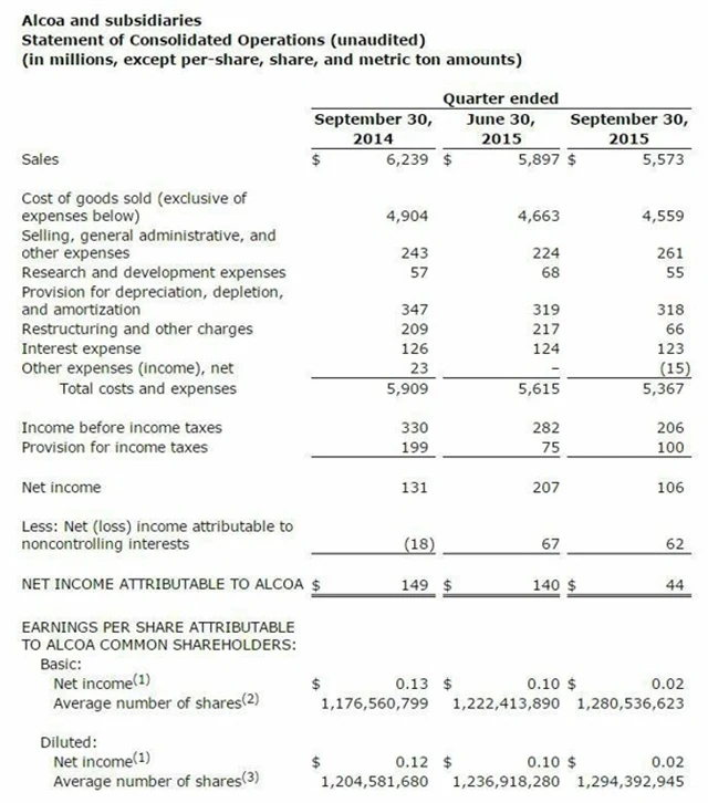 - Výsledky Alcoa v 3Q2015: Zisk na akcii 0,02 USD (loni: 0,12 USD), upravený zisk na akcii 0,07 USD (odhad: 0,13 USD), tržby 5,57 miliardy USD (odhad: 5,66 miliardy USD).