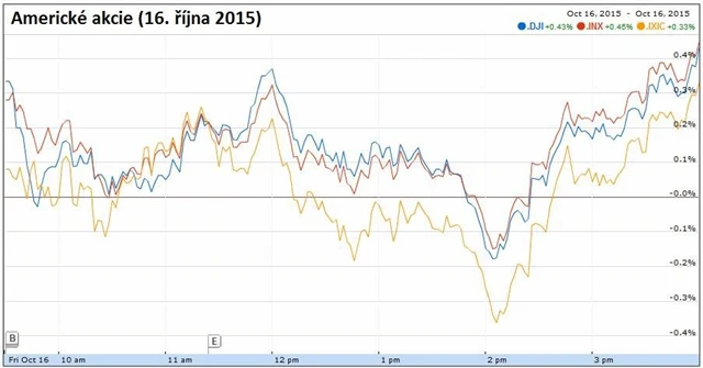 Dow v pátek zakončil silnější o 0,43 % na 17 215,97 bodu, S&P 500 posílil o 0,46 % na 2 033,11 bodu a Nasdaq Composite vzrostl o 0,34 % na 4 886,69 bodu. Posílily akcie v osmi z deseti hlavních odvětví v čele se sektory zdravotní péče a necyklického spotřebního zboží, ztrácely pouze průmyslové firmy a odvětví základních materiálů. Index volatility VIX klesl o 6,23 % na 15,05 bodu a výnos 10letých vládních dluhopisů USA stoupl o jeden bazický bod na 2,0298 %.