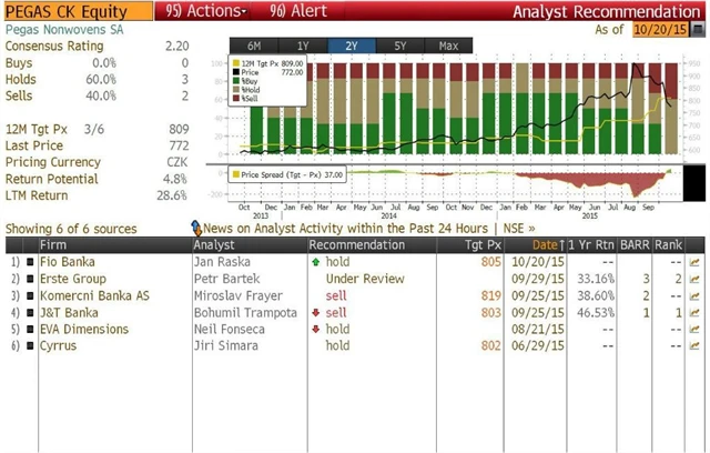 "Tržní cena akcií výrobce netkaných textilií Pegas Nonwovens od letošního srpna postupně klesala z historických maxim kolem 950 Kč až k naší cílové ceně 805 Kč, a postupně tak naplňovala naše investiční doporučení 'redukovat'. Podle našich předpokladů tak akcie Pegasu postupně korigovaly z úrovní, které jsme považovali za nadhodnocené a vybízející k realizaci zisků," napsal Raška.