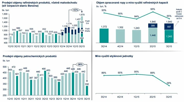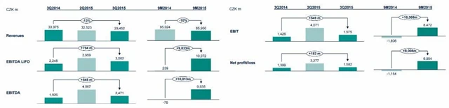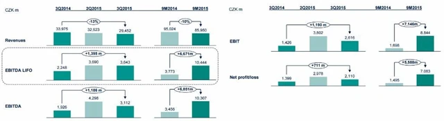 Po očištění o jednorázové položky činil zisk EBITDA LIFO ve 3Q2015 3,643 miliardy Kč (2Q2015: 3,69 miliardy Kč, loni: 2,248 miliardy Kč) a čistý zisk dosáhl 2,11 miliardy Kč (2Q2015: 2,978 miliardy Kč, loni: 1,399 miliardy Kč).