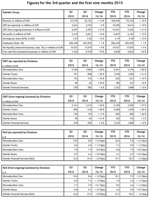 Firma vykázala rekordní tržby své značky Mercedes-Benz a růst zisků z pokračujících operací. Tržby vzrostly o 13 % na 37,3 miliardy EUR. Zisk z pokračujících operací se zvýšil o 31 % na 3,66 miliardy EUR (odhad: 3,39 miliardy EUR).