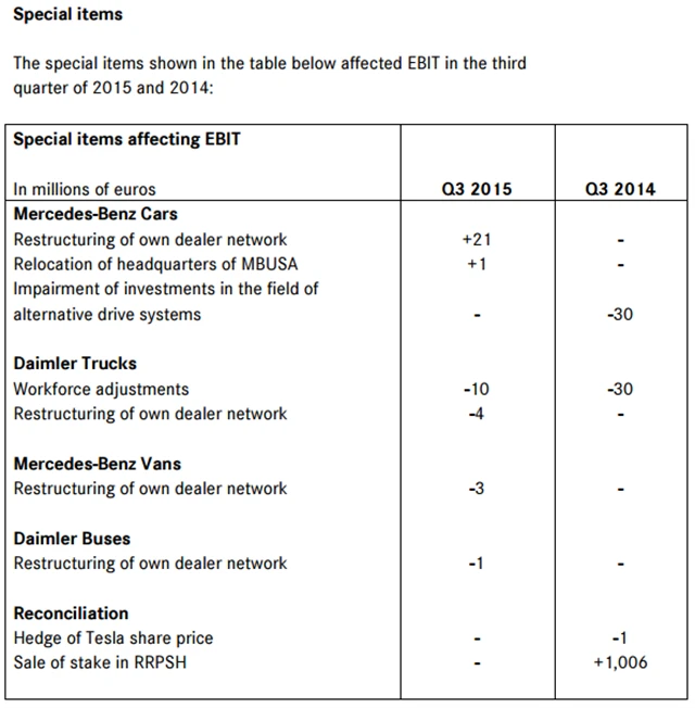 Německému výrobci aut nicméně klesl ve 3Q2015 čistý zisk o 14 % na 2,4 miliardy EUR (odhad analytiků FactSet: 2,1 miliardy EUR). K poklesu však došlo především vlivem vysokých jednorázových položek, které pozitivně ovlivnily zisk v předchozím roce (zejména prodej miliardového podílu v Rolls-Royce Power Systems).