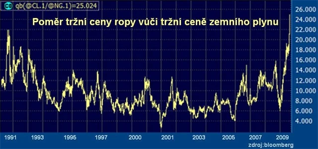 Průměrný poměr ceny ropy vůči zemnímu plynu je od jara 1990 na hodnotě 9,38. Aktuální hodnota okolo 25, což je nejvíce za posledních devatenáct let.