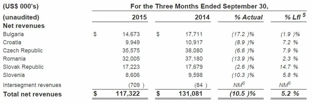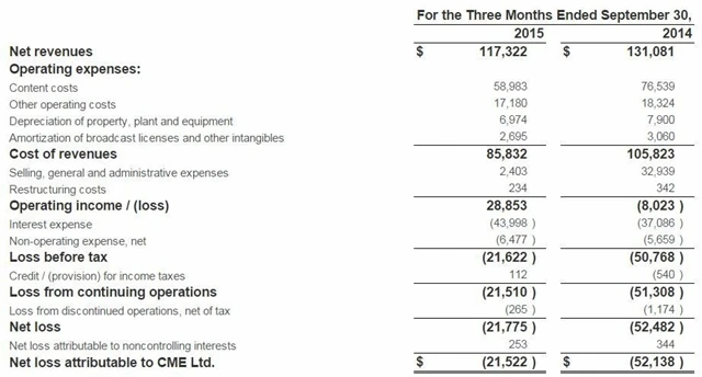 Bez vyloučení vlivu změn kurzů firmě klesly příjmy na všech šesti trzích. V České republice firma dosáhla tržeb 35,58 milionu USD, meziročně o 6,6 % méně. V Bulharsku CME výnosy klesly o 17,2 %, v Chorvatsku o 8,9 %, v Rumunsku o 13,9 %, na Slovensku o 2,6 % a ve Slovinsku o 10,3 %. Při stálých kurzech se výnosy snížily jen v Bulharsku, a to o 1,9 %. Nejvíce naopak při fixních kurzech stouply na Slovensku (+14,7 %) a v ČR (+7,9 %). Výsledky tak ovlivnil meziročně výrazně silnější dolar.