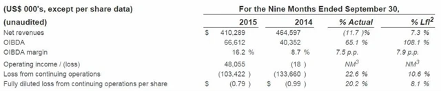 Provozní zisk OIBDA se společnosti ve srovnání s loňským třetím čtvrtletím při konstantních kurzech dokonce téměř ztrojnásobil na 8,35 milionu USD z 2,94 milionu USD. Výrazně se zmenšila také ztráta z pokračujících operací, která v letošním třetím čtvrtletí činila 21,51 milionu USD, zatímco loni to v období od července do září bylo 51,31 milionu USD. Ztráta na akcii z pokračujících operací se meziročně snížila na 0,17 USD z 0,38 USD.
