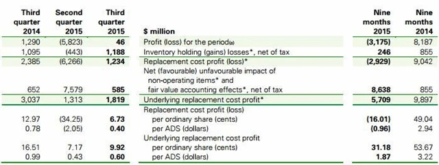 BP oznámila za 3Q2015 40% propad zisku. Na vině byla hlavně levná ropa, jejíž ceny se propadly na minimum od roku 2009. Zisk očištěný o jednorázové položky a změny zásob dosáhl za tři měsíce končící zářím celkově 1,82 miliardy USD. Analytici oslovení agenturou Bloomberg přitom počítali pouze s 1,26 miliardy USD.