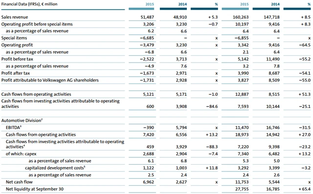 Volkswagen upozornil, že výsledky za třetí čtvrtletí zahrnují mimořádné náklady 6,7 miliardy eur na budoucí opatření související se skandálem kolem měření emisí. Koncern v září přiznal, že do zhruba 11 milionů naftových aut po celém světě instaloval software umožňující manipulovat s testy emisí.