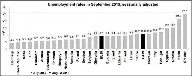 Nejnižší míru nezaměstnanosti vykázaly Německo (4,5 %), Česká republika (4,8 %), Malta (5,1 %) a Spojené království (5,3 % za červenec 2015), naproti tomu největší podíl nezaměstnaných zaznamenaly Řecko (25 % za červenec 2015) a Španělsko (21,6 %).