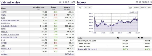 Index PX v pátek připsal 0,37 % na 983,14 bodu. Za celý říjen je burza více než procento v plusu, přestože celý uplynulý týden pro ni byl mírně ztrátový.