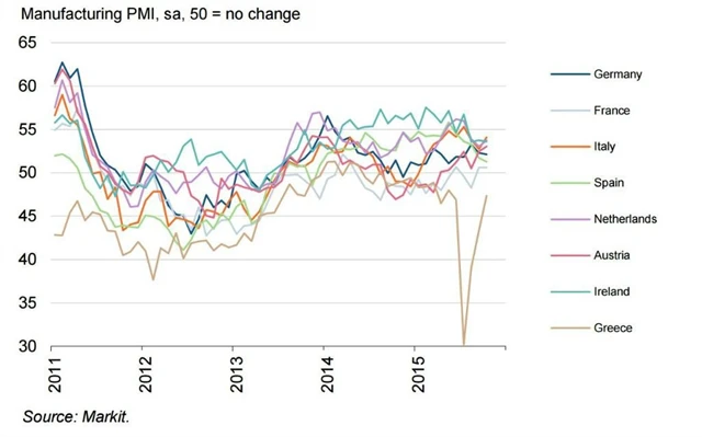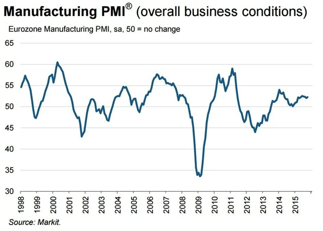 Index nákupních manažerů ve zpracovatelském sektoru eurozóny podle finálních dat agentury Markit v říjnu vyskočil na 52,3 bodu ze zářijových 52 bodů, předběžná data přitom hlásila stagnaci. Většina zemí zaznamenala expanzi a Řecko, které stále vykazuje pokles, náskok ostatních států rychle snižuje. Stále však klesají ceny vstupů v regionu, a to nejprudším tempem za posledních devět měsíců.