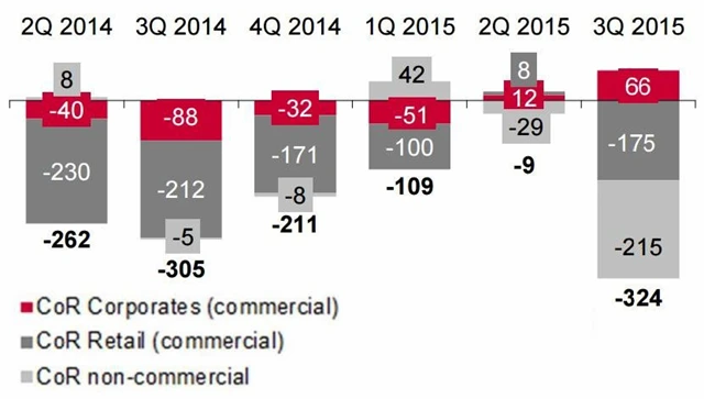 Provozní náklady Komerční bance v meziročním srovnání klesly o 1,9 % na 3,19 miliardy Kč. Náklady na rizika naopak stouply o 6,2 % na 324 milionů Kč z 305 milionů Kč ve třetím čtvrtletí 2014, v letošním druhém čtvrtletí dosáhly náklady na rizika jen 9 milionů Kč. Za prvních devět měsíců roku se náklady na rizika meziročně snížily o 59 % na 442 milionů Kč.