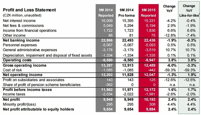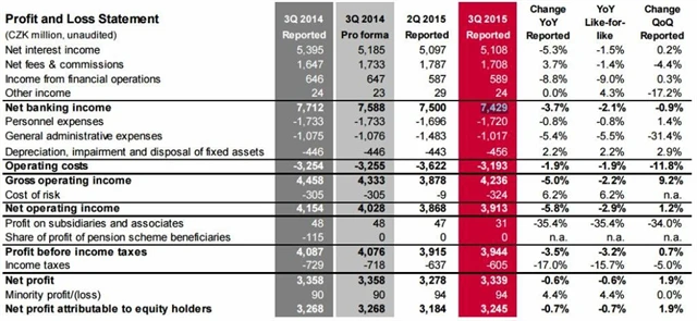 Čistý provozní zisk za letošní 3Q dosáhl 3,91 miliardy Kč, zisk před zdaněním 3,94 miliardy Kč a čistý zisk připadající akcionářům banky meziročně klesl o 0,7 % na 3,25 miliardy Kč a anualizovaný zisk na akcii dosahoval k 30. září 349 Kč proti loňským 341 Kč.
