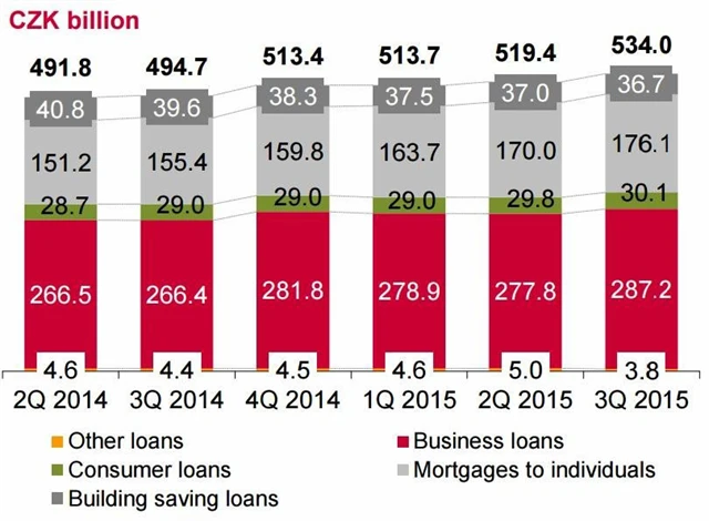Objem úvěrů se bance v meziročním srovnání zvýšil o 7,94 % na 534 miliard Kč. Objem úvěrů firmám dosáhl 287,2 miliardy Kč a objem hypoték se zvýšil na 176,1 miliardy Kč ze 155,4 miliardy Kč ve 3Q2014. Zájem o hypotéky nadále podporují nízké úroky. Růst objemu hypoték nicméně částečně kompenzoval pokračující pokles zájmu o úvěry ze stavebního spoření, když objem úvěrů poskytnutých Modrou pyramidou klesl o 7,1 % na 36,7 miliardy Kč. Objem poskytnutých spotřebitelských úvěrů se meziročně zvýšil o 4 % na 30,1 miliardy Kč.