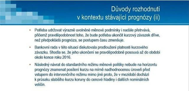 Bankovní rada ČNB rozhodla nadále používat devizový kurz jako další nástroj uvolňování měnových podmínek a potvrdila závazek ČNB v případě potřeby intervenovat na devizovém trhu na oslabení koruny tak, aby udržovala kurz koruny vůči euru poblíž hladiny 27 EUR/CZK. Bankovní rada se navíc shodla na tom, že ukončení režimu devizových intervencí se pravděpodobně odsouvá až do období kolem konce roku 2016. Dosud centrální bankéři hovořili o tom, že režim intervencí neopustí dříve než ve druhé polovině příštího roku.