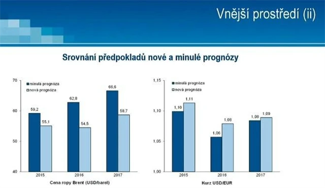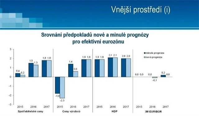 ČNB ve čtvrtek také zveřejnila novou makroekonomickou prognózu, ve které zlepšila odhad růstu české ekonomiky v letošním roce na 4,7 % z předchozích 3,8 %. Pro příští rok centrální banka odhad ponechala na 2,8 %. Odhad vývoje inflace ČNB mírně zvýšila s tím, že v roce 2017 se inflace bude pohybovat nad 2% inflačním cílem.