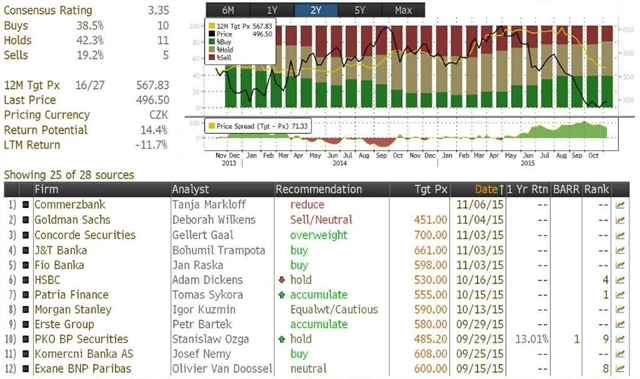 Průměrná cílová cena akcií ČEZ aktuálně dosahuje zhruba 568 Kč. Podle agentury Bloomberg deset analytiků akcie firmy doporučuje kupovat, jedenáct držet a pět prodávat. Trampota má na akcie ČEZ doporučení "kupovat" s cílovou cenou 661 Kč a Bártek doporučuje akcie "akumulovat" s cílovou cenou 580 Kč.