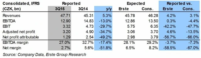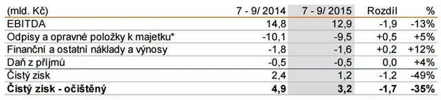 V samotném třetím čtvrtletí tržby dosáhly 47,71 miliardy Kč, loni to ve stejném období bylo 45,31 miliardy Kč. Zisk EBITDA firmě ve srovnání s loňským třetím kvartálem klesl o 13 % na 12,9 miliardy Kč, čistý zisk se ve třetím čtvrtletí meziročně snížil o 49 % na 1,2 miliardy Kč a očištěný čistý zisk spadl meziročně o 35 % na 3,2 miliardy Kč.