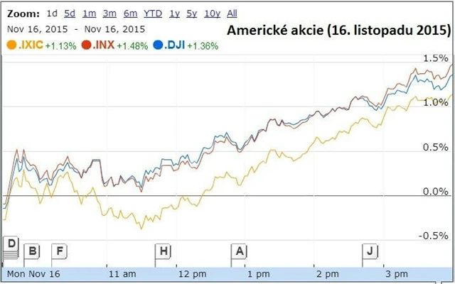 Americké akcie v první polovině pondělního obchodování převážně rostly. Investoři totiž neočekávají žádné výraznější ekonomické dopady pátečních teroristických útoků v Paříži. Den zakončily s více než procentním ziskem.