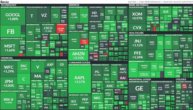 Akciové trhy ve Spojených státech v první polovině středečního obchodování posilovaly. K růstu velkou měrou přispívaly akcie technologického gigantu Apple i firem působících ve zdravotnickém sektoru. Investoři čekali na zveřejnění zápisu z říjnového zasedání americké centrální banky, který potvrdil velkou míru odhodlání centrální banky zvýšit sazby poprvé po téměř deseti letech již v prosinci. Akcie nakonec zpevnily o procento a půl.
