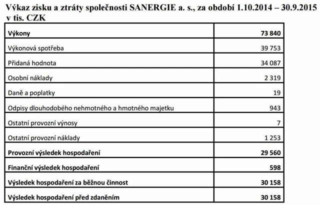 Společnost Sanergie vykázala za období od 1. 10. 2014 do 30. 9. 2015 provozní zisk 29,56 milionu Kč a zisk před zdaněním 30,16 milionu Kč. Tržby Sanergie činily za uvedené období 73,84 milionu Kč, meziročně se zvýšily o 3,7 milionu Kč, což bylo dáno zejména větším počtem slunečných dní a vyšší výrobou elektřiny.