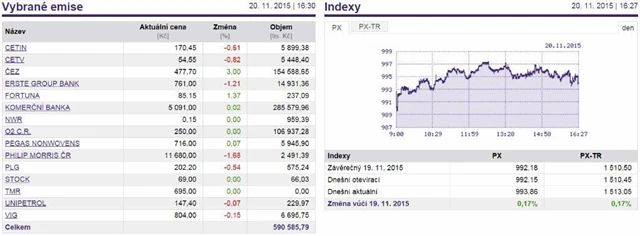 Index PX v pátek vzrostl o 0,17 % na 993,86 bodu. Za celý týden hlavní benchmark pražské burzy vzrostl o 1,3 %. Nejvíce za pět obchodních dní zdražily akcie CETV, propadly se naopak cenné papíry NWR.