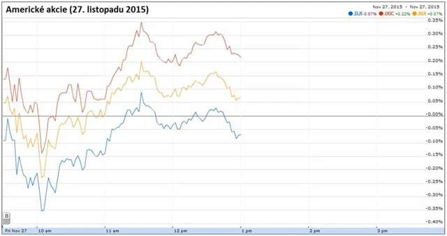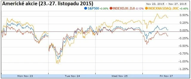 Americké akcie zakončily páteční obchodní seanci kolem nuly. Ve čtvrtek zůstaly trhy celý den zavřené kvůli oslavám Dne díkůvzdání a v pátek se obchodovalo netradičně pouze do 19.00 SEČ. Investoři v závěru týdne sledovali hlavně nákupní apetit amerických spotřebitelů během slevové akce Black Friday. Ani v týdenním horizontu akcie nenašly jednoznačný směr.