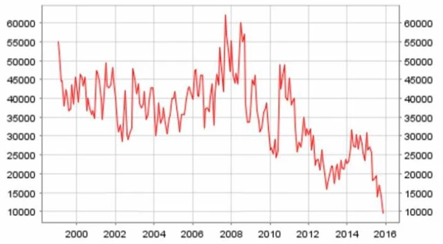 Evropské kvantitativní uvolňování a nízké úrokové sazby vedly k poklesu objemu obchodů na evropském mezibankovním trhu. Přiložený graf ukazuje vývoj objemu mezibankovních půjček kotovaných sazbou EONIA v milionech eur.