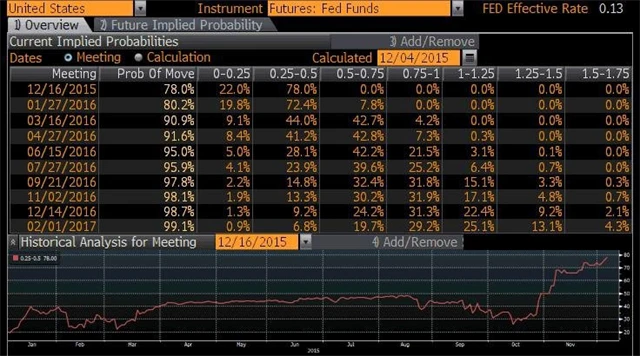 Pravděpodobnost, že Fed sazby zvýší již tento měsíc, je podle dat agentury Bloomberg aktuálně 78%. Data burzovní skupiny CME Group pravděpodobnost zvýšení sazeb na prosincovém zasedání Fedu stanovují na 79,1 %.