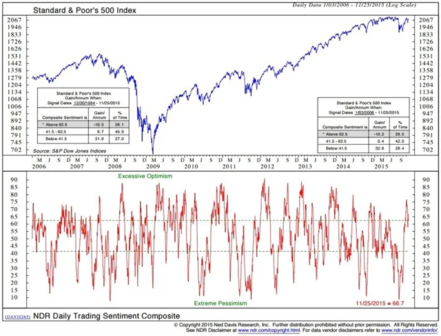 Analytici ze společnosti Ned Davis Research upozorňují, že se sentiment na burzách v USA aktuálně pohybuje kolem horní hrany neutrálního pásma. Ještě v listopadu se ale nacházel v oblasti nadměrného optimismu, což není pro vstup do nového roku ideální.