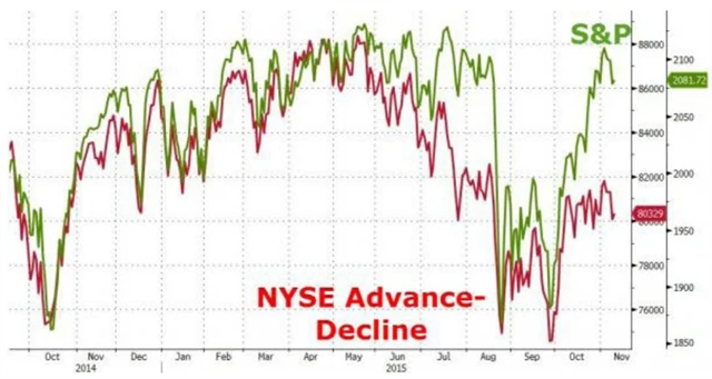 Ani hloubka trendu není nejpříznivější, varuje LMTR. Dokládá to pohled na graf, který ilustruje, že na vysokých úrovních drží index S&P 500 jen relativně malý počet titulů. Nerovnováha se začala vytvářet v polovině října a od té doby došlo k jejímu výraznému prohloubení.