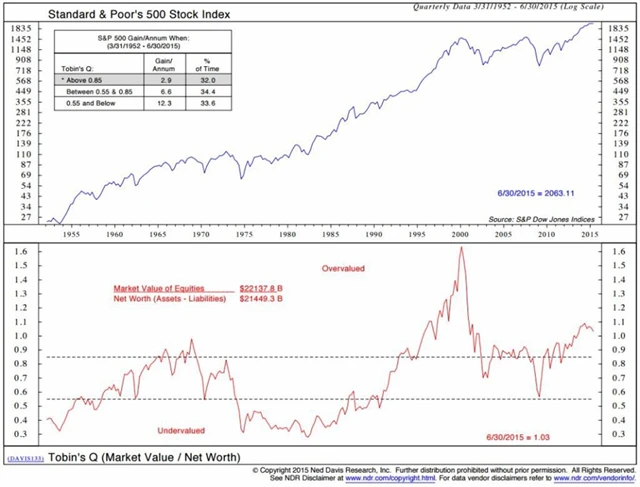 Velkým fondům se navíc není co divit, že na burzy nelijí další miliardy dolarů. Aktuální valuace cenných papírů z indexu S&P 500 totiž naznačuje, že jsou americké akcie nadhodnocené. Tobinův Q-poměr se pohybuje kolem 1,03, což je druhá nejvyšší hodnota za více než 70 let.