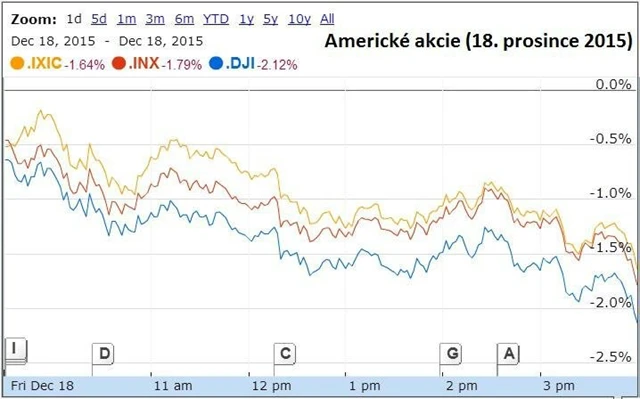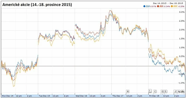- Americká centrální banka rozhodla, že se základní úroková sazba v USA po sedmi letech odlepí od technické nuly. Měnový výbor Fedu, který rozhoduje o nastavení měnové politiky v USA, oznámil, že se sazba zvýší o 25 bazických bodů na 0,25-0,5 %. Pro zvýšení úrokové sazby hlasovali všichni členové FOMC. Výhled sazby pro příští rok Fed ponechal na 1,375 %. Naposledy banka základní úrokovou sazbu zvýšila v roce 2006.