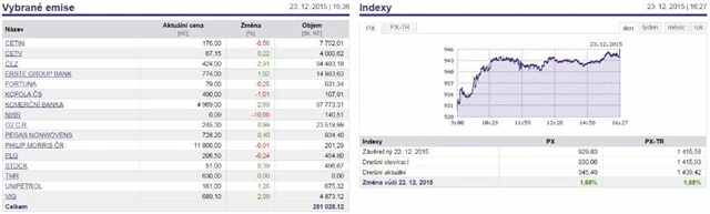 Index PX ve středu vzrostl o 1,68 % na 945,49 bodu. Do konce týdne se již na pražském parketu kvůli vánočním svátkům obchodovat nebude. Od pondělí do středy index PX připsal 1,7 %.