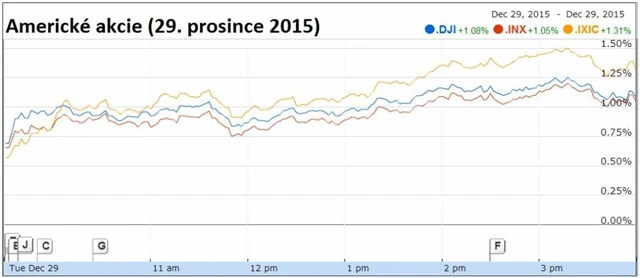 Dow posílil o 1,1 % na 17 720,98 bodu, širší S&P 500 přidal 1,06 % na 2 078,36 bodu a Nasdaq Composite uzavřel se ziskem 1,33 % na 5 107,94 bodu. Index volatility VIX klesl o 4,91 % na 16,08 bodu a výnos 10letých vládních dluhopisů USA se zvýšil o více než sedm bazických bodů na 2,3068 %.
