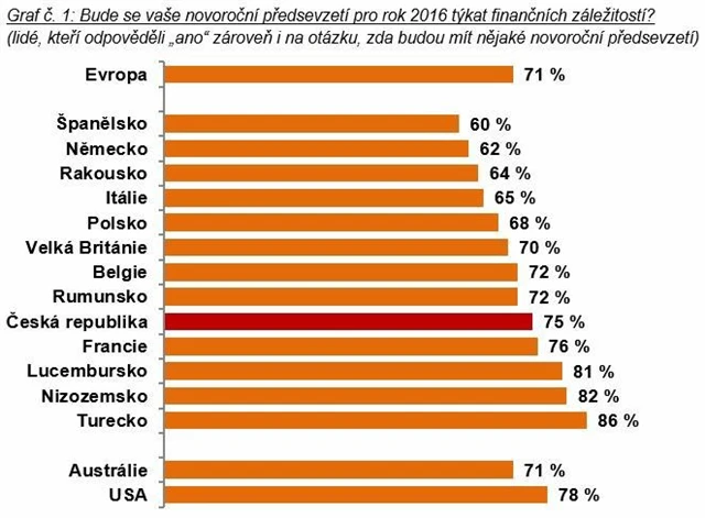 A jak to vypadá s dodržováním předsevzetí? Zde se situace dost liší podle regionů. Zatímco v Rakousku nebo Německu sedm z deseti (68 %) dotázaných své loňské finanční předsevzetí dodrželo, v Turecku, Španělsku nebo Itálii jsou na tom právě opačně - více než polovina lidí v těchto zemích své finanční plány v roce 2015 nenaplnila. V České republice se podařilo finanční předsevzetí dodržet 55 % dotázaných, zbytek při jejich naplňování selhal.
