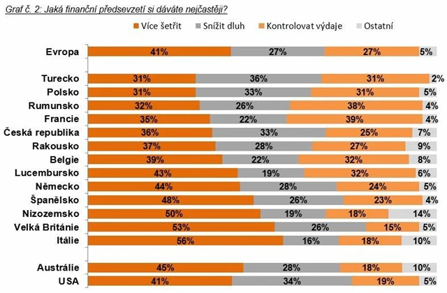 Nejčastějším finančním předsevzetím Evropanů je více spořit (41 %), kontrolovat lépe výdaje (27 %) a snížit zadlužení (27 %). Spořivější chce být více než polovina Italů (56 %) a Britů (53 %) a snižovat dluhy si přeje více než třetina obyvatel Turecka (36 %) i třetina Čechů (33 %). O zlepšení kontroly výdajů se chce pokusit každý třetí Francouz (39 %) a Rumun (38 %). Mezi Čechy je nejčastějším finančním novoročním předsevzetím více spořit (36 %). Třetina respondentů pak plánuje snižovat dluhy a další čtvrtina chce v příštím roce lépe kontrolovat své výdaje.