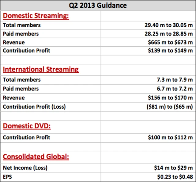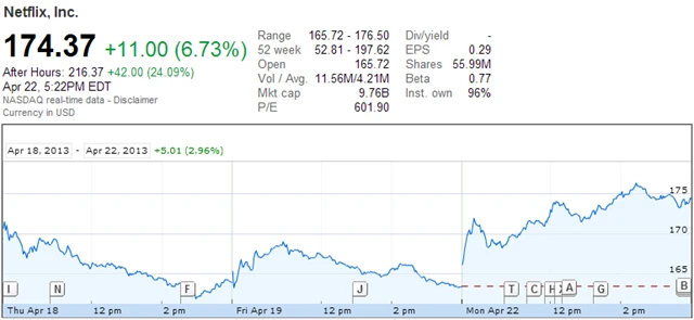Tržby v souladu s očekáváním, ale výrazně lepší zisk i výhled ziskovosti poslaly v after-marketu akcie Netflixu o čtvrtinu výše. Tržby byly přesně podle odhadů 1,02 miliardy USD, zisk na akcii 31 centů namísto očekávaných 20 centů, výhled zisku na akcii ve 2Q2013 23 až 48 centů oproti odhadovaným 30 cnetům.