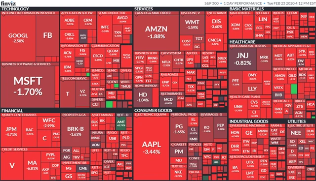 Akcie ve Spojených státech v úterý pokračovaly v prudkém propadu. Onemocnění způsobené novým typem koronaviru se šíří po světě, což investory nutí přesouvat své peníze do bezpečnějších investic.