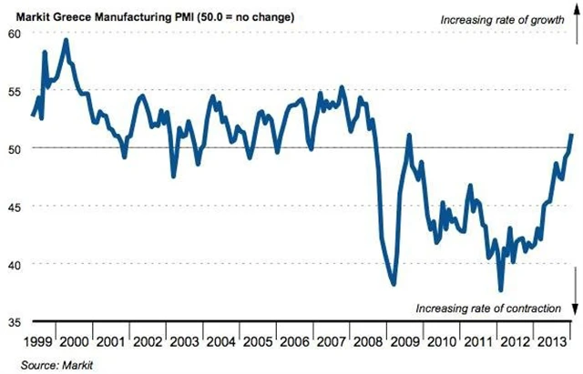 Index nákupních manažerů ve zpracovatelském sektoru v Řecku stoupl poprvé za posledních 53 měsíců do pásma, které značí oživení. Konkrétně na hodnotu 51,2 bodu z 49,6 bodu v prosinci. Hlavní indikátor stoupal vlivem rychlejšího nárůstu produkce a nových objednávek.