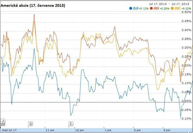 Americké akciové trhy reagovaly na středeční vystoupení šéfa centrální banky USA Bena Bernankeho mírným růstem. Po ukončení obchodování zveřejnily hospodářské výsledky ještě společnosti IBM, Intel, eBay a American Express.