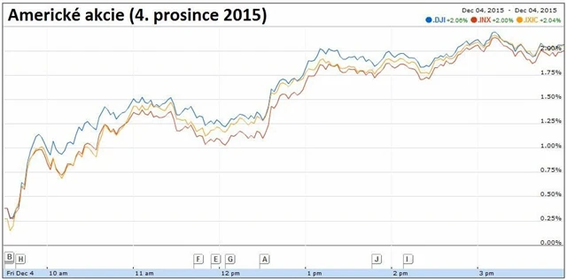 Index Dow vyskočil o 2,12 % na 17 847,63 bodu, širší S&P 500 zpevnil o 2,05 % na 2 091,69 bodu a Nasdaq Composite připsal 2,08 % na 5 142,27 bodu. Index volatlity VIX spadl o 18,22 % na 14,81 bodu a výnos 10letých vládních dluhopisů USA se snížil o čtyři bazické body na 2,271 %.