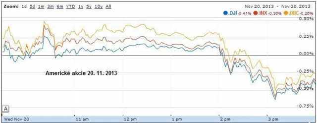 Index S&P tak klesal již třetí den v řadě. Dařilo se akciím J.C. Penney, které vyskočily o 8,38 % poté, co pokles tržeb firmy ve třetím čtvrtletí zeslábl. Akcie Yahoo! posílily o 2,86 %, když majitel portálu zvýšil plán na odkup akcií na 5 miliard USD. Dařilo se i akciím strojírenské firmy Deere, které přidaly 2,06 % po dobrých výsledcích. Zisk na akcii byl ve 3Q2013 2,11 USD proti odhadu 1,90 USD. Nedařilo se naopak akciím Lowe's, které po špatných výsledcích propadly o 6,17 %.