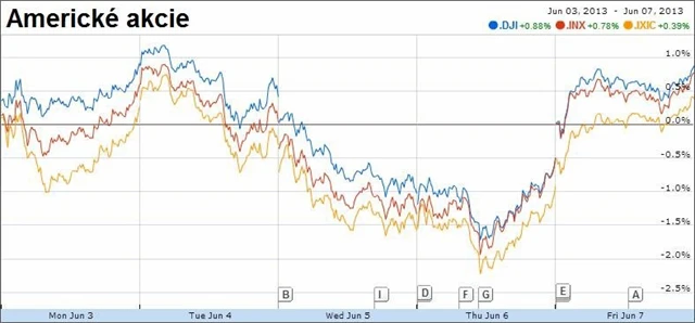 Dow Jones Industrial Average v pátek vzrostl o více než 200 bodů na 15 248,12 bodu (+1,38 %), S&P 500 zakončil týden na 1 643,38 bodu (v pátek +1,28 %) a Nasdaq na závěr týdne vzrostl o 1,32 % na 3 469,22 bodu. Dow za celý týden posílil o 0,88 %, širší S&P 500 0,78 % a technologický Nasdaq 0,39 %.