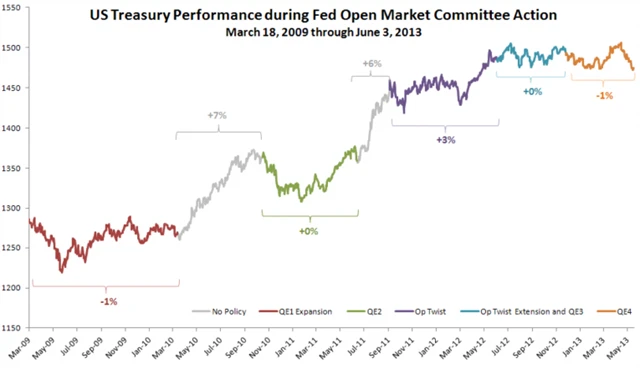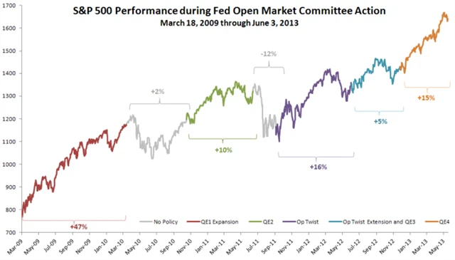 Mimochodem, měnový výbor Fedu zasedá 18. a 19. června. Ekonomové oslovení agenturou Bloomberg nejčastěji očekávají, že Fed omezí nákupy dluhopisů na 65 miliard USD na svém zasedání na konci října. Co stihlo kvantitativní uvolňování za uplynulá léta udělat s cenami akcií a amerických státních dluhopisů, se na závěr týdne můžete přesvědčit ve dvou jasných grafech.