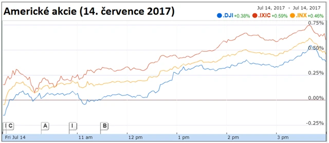 Index Dow v pátek stoupl o 0,39 % na nové zavírací maximum 21 637,74 bodu, širší index S&P 500 se zvýšil o 0,47 % na nové zavírací maximum 2 459,27 bodu a index technologického trhu Nasdaq Composite uzavřel se ziskem 0,61 % na 6 312,47 bodu. Absolutní maximum posunul Dow na 21 681,53 bodu a S&P 500 jej navýšil na 2 463,54 bodu. Index volatility VIX klesl o 3,94 % na 9,51 bodu a výnos 10letých vládních dluhopisů USA se snížil o jeden a půl bazického bodu na 2,33 %.