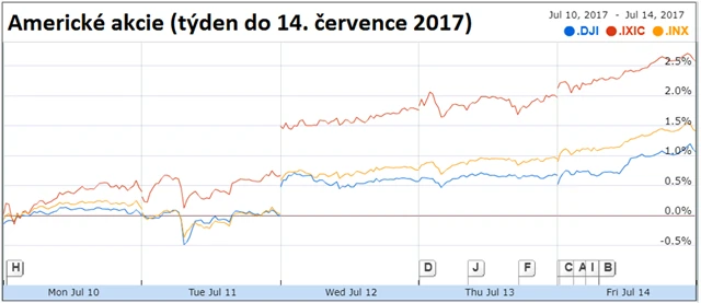 Hlavní akciové indexy vzrostly i za celý týden, Dow o 1,05 %, S&P 500 o 1,4 % a Nasdaq Composite o 2,6 %.